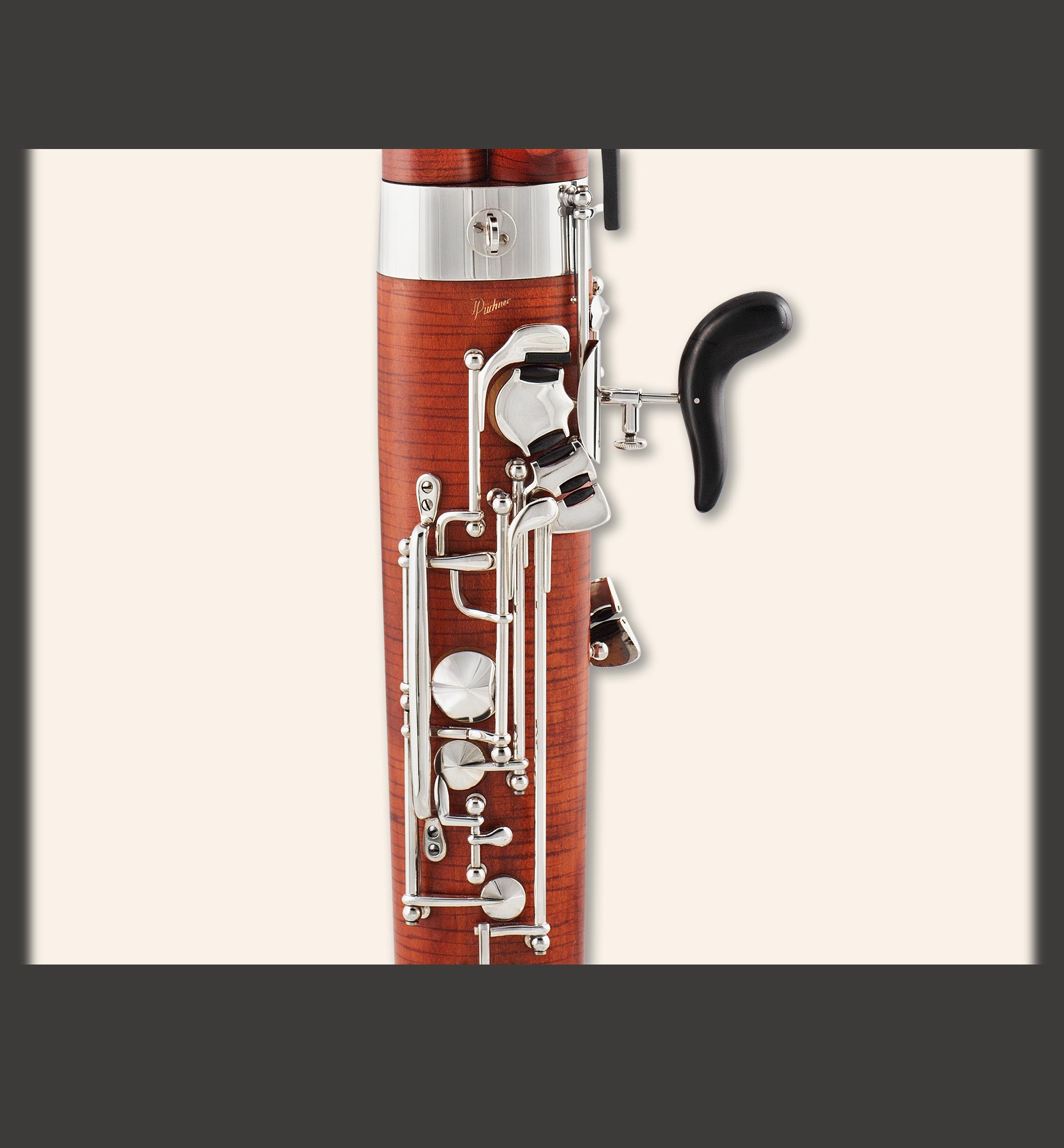 Professional. Silver-plated mechanism, automatic G ring key, high-D key, high-E key, E-F# trill, Eb key on wing joint, whisper-key mechanism operated on wing joint and self-acting from low-E key, whisper-key lock for left thumb, link between A and whisper-key, Ab-Bb trill key on boot joint for right thumb, B and Bb keys on long joint held in by individual brackets;